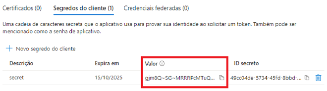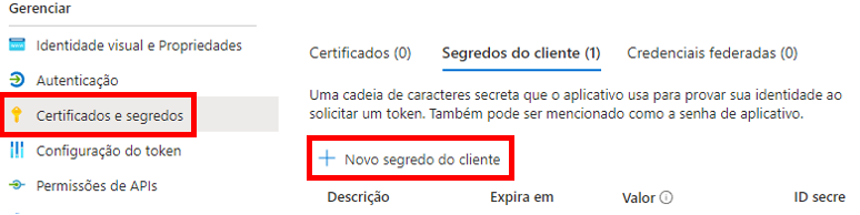 Na seção "Certificados e Segredos":