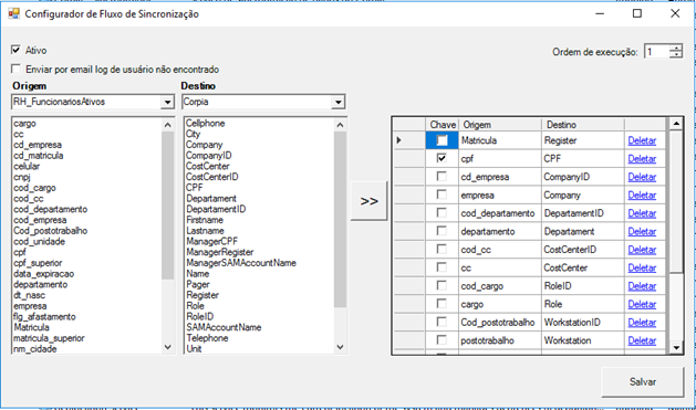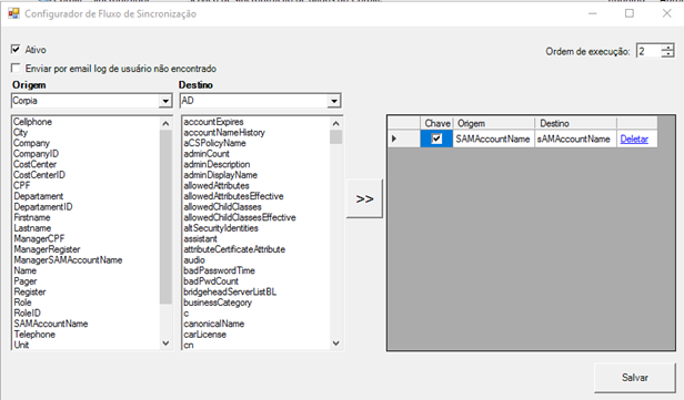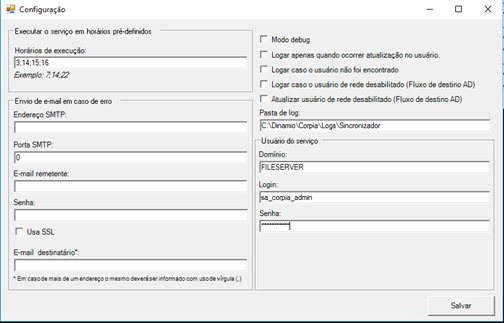 | Modo teste | Sim ou Não. Se “Não”, o sincronizador apenas produz um log das alterações que seriam realizadas |