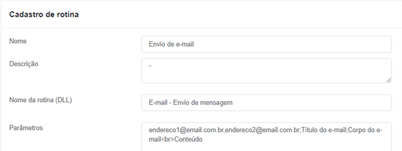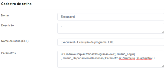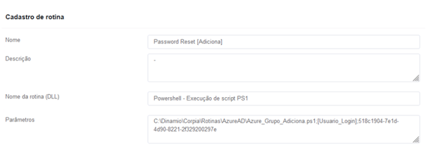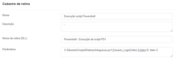 Criar a rotina para execução. No campo “Parâmetros” é necessário informar o caminho completo do script Powershell (que deve estar localizado no servidor do Corpia), e também os valores que devem ser repassados ao programa powershell como argumento, separando-os por “ ; “: