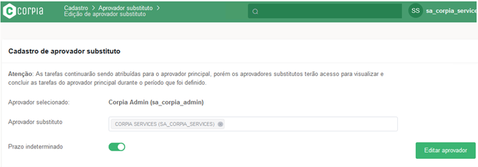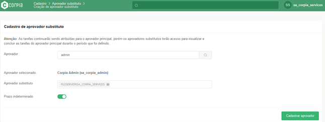 O aprovador substituto é uma medida utilizada em situações em que o aprovador principal não está disponível para concluir as tarefas de aprovação. Após o cadastro do aprovador substituto, as tarefas continuarão sendo atribuídas ao aprovador principal. No entanto, os aprovadores substitutos terão permissão para visualizar e concluir as tarefas do aprovador principal durante o período definido.