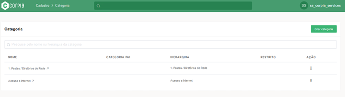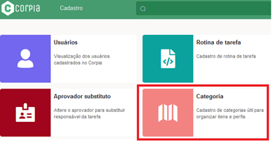 As categorias são utilizadas para organizar itens e perfis dentro do sistema. Para consultar o cadastro existente ou adicionar uma nova categoria, siga estas etapas: