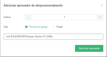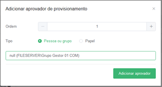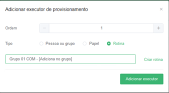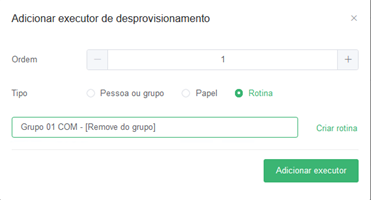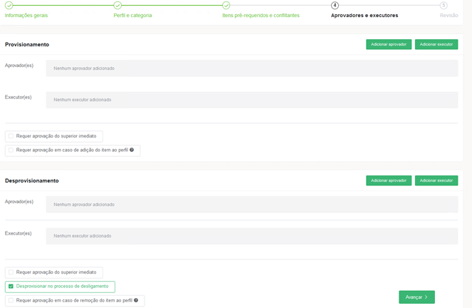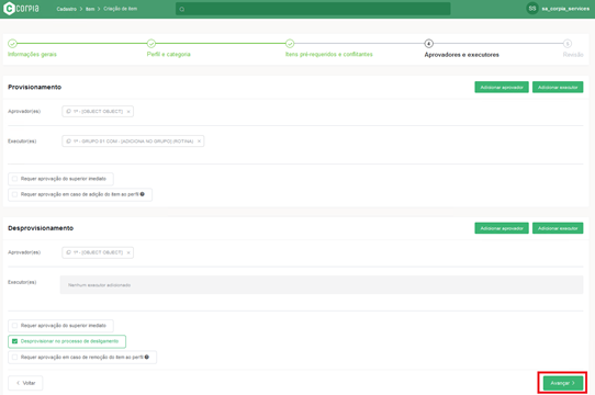 Nesta etapa, você definirá os executores e aprovadores responsáveis pelo provisionamento ou desprovisionamento do item.