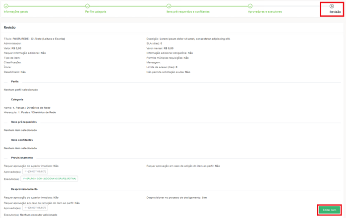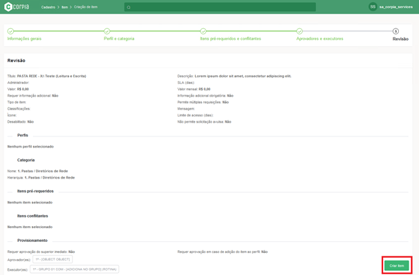 Na etapa de revisão, será apresentado um resumo das informações inseridas nas etapas anteriores. Se todas as informações estiverem corretas, clique em "Criar Item" para finalizar o processo de criação do item.