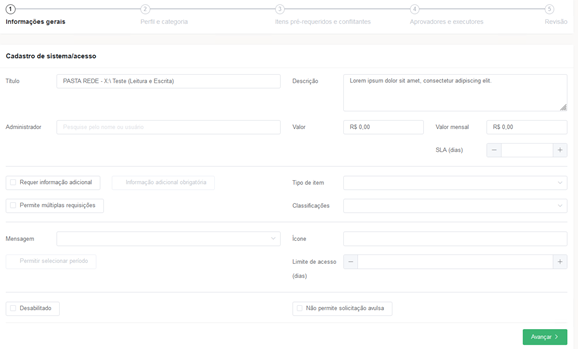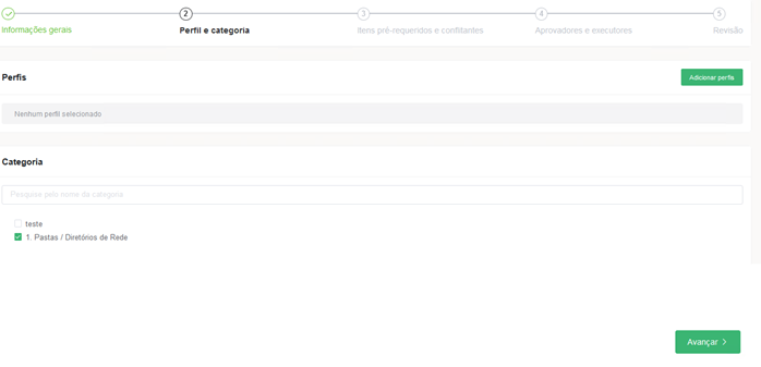 Certifique-se de que os perfis e/ou categorias utilizados no item foram previamente cadastrados para seleção. Clique em "Avançar" quando concluído.
