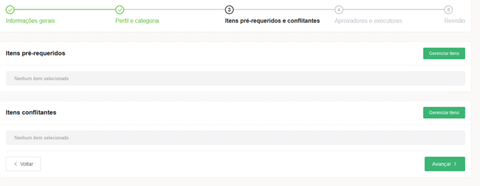 Se o item que está sendo cadastrado possuir pré-requisitos ou conflitos com outros itens, você pode adicioná-los na seção "Gerenciar itens". Após configurar essas informações, clique em "Avançar".