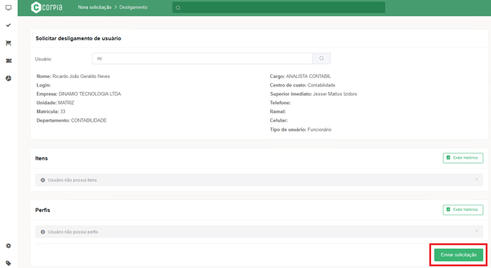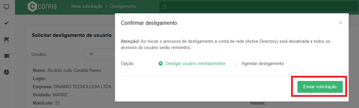 Após a definição do período de desligamento, clique em "Enviar solicitação".