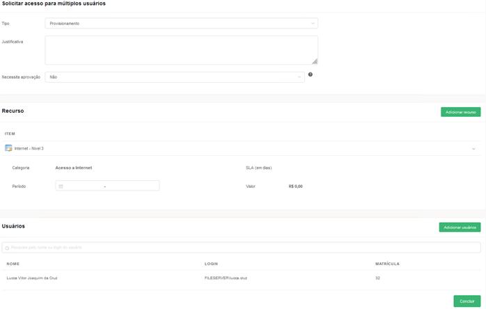 Após o preenchimento dos campos na página de solicitação de provisionamento e desprovisionamento para múltiplos usuários, clique em "Adicionar recurso".